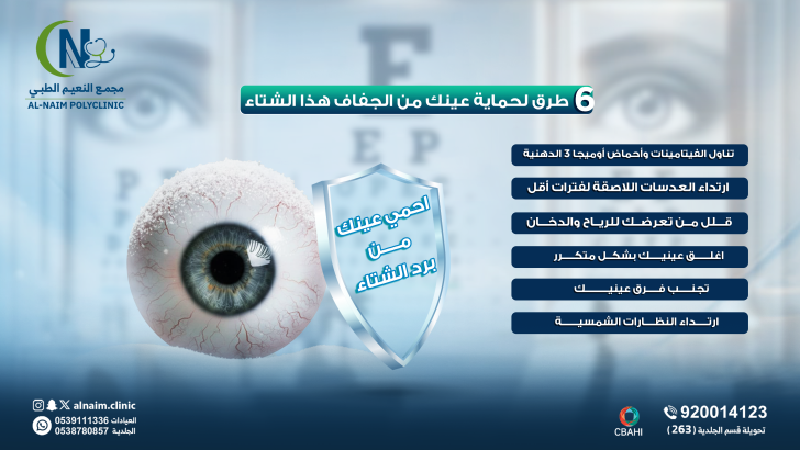 لحماية عينيك من الجفاف، حافظ على ترطيب جسمك بشرب الماء، خذ فترات راحة منتظمة عند استخدام الشاشات، استخدم مرطبات الجو،